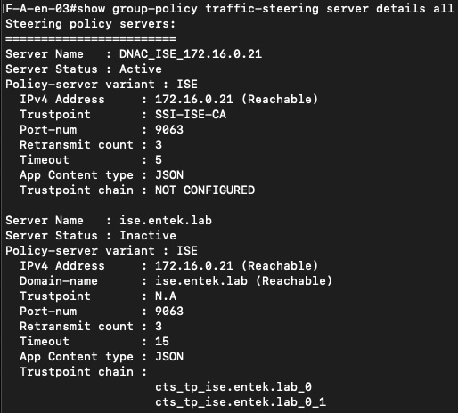 In the screenshots, the policy server list clearly shows ISE as the active server, while Catalyst Center appears only as an inactive reference. This confirms the functional separation in the design: Catalyst Center provisions intent and enables SSI, but ISE is the system that distributes the steering policy to the switches.