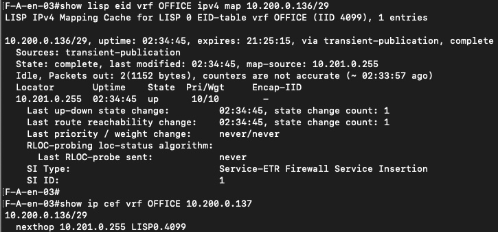 When SSI is enabled, the firewall IP address is no longer “just” an IP on a transit network. It is installed in LISP as a service EID, associated with a specific virtual network, VRF, and border RLOC. The output clearly shows the firewall registered as a Service-ETR, complete with reachability state and locator information.