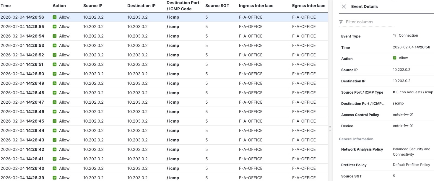The FMC logs clearly show traffic entering and leaving on the same transit interface, effectively hairpinning within the virtual network. At the same time, the firewall has full visibility into source IP, destination IP, and source SGT, allowing identity-based policies to be enforced exactly as intended.